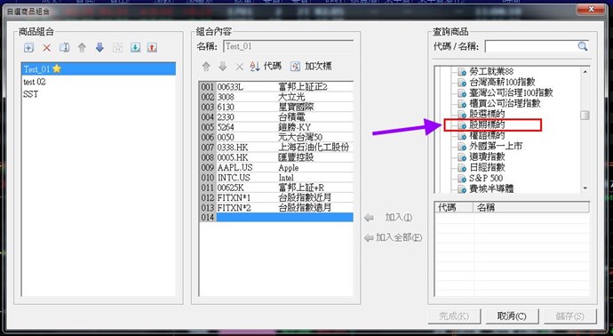 在設定商品組合時,僅能選擇股票期貨類別,如何選擇全部股票期貨之現貨為組合標的,以供設定策略或選股時,僅針對有發行股期範圍過濾,謝謝。