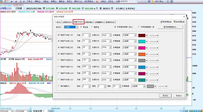 您好,請問是指技術分析嗎? 按右鍵→設定的【移動平均】標籤,可設定均線顏色。