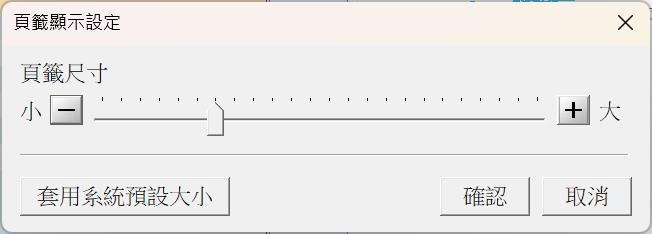 您好,7.10.01/3.10.01以後的版本可以在頁籤上按右鍵,並點選如下圖的“頁籤顯示設定”,可以單獨調整頁籤大小。