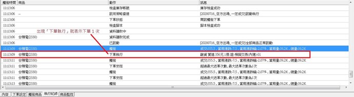 您好,執行紀錄出現「下單執行」表示下單 1 次,如圖,