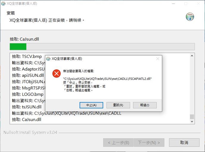 無法開啟要寫入的檔案 "C:\SysJust\XQLite\XQTrade\JSUN\exe\CADLL\FSCAPIATL2.dll"