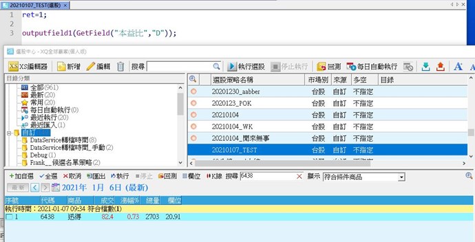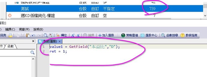 你在程式碼中 ret = 1 之前加入 value1 = GetField("本益比","D") 這一行跑看看結果