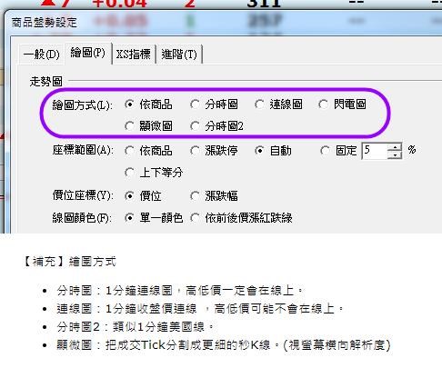 ◎分時圖:1分鐘連線圖,高低價一定會在線上。(分時圖是每分鐘小bar,其實是一個長條狀,若用不習慣可以切換成"連線圖"試看看)