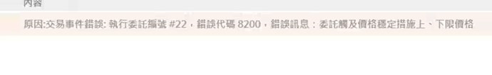 我這樣一兩個月停利出場都會遇到價格瞬間穩定機制送市價單,會跳錯誤,導致策略需要個股重啟才能出場