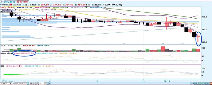 value1=bollingerBand(c,20,2); value2=bollingerBand(c,20,-2); value3=100*(value1/value2-1); if value3>2 then alert("布林通道寬度大於2%");