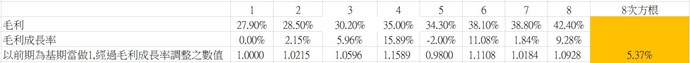 如果我想寫8期毛利成長率的幾何平均,該如何寫呢?