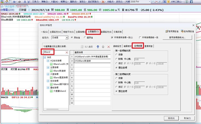 1.主圖疊圖指標的「BBand width(布林通道寬度指標)」。