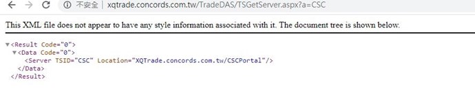 您好,請協助在CHROME瀏覽器裡面輸入http://xqtrade.concords.com.tw/TradeDAS/TSGetServer.aspx?a=CSC