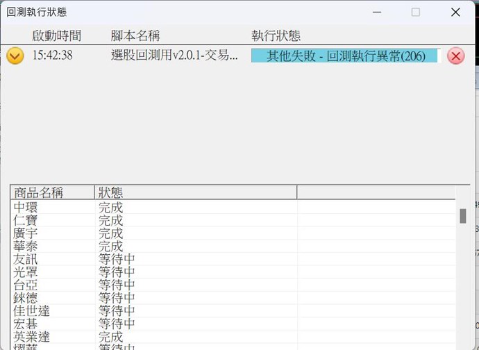 回測執行異常(206) 是回測計算逾時的錯誤,可能是當下伺服器忙碌所造成。