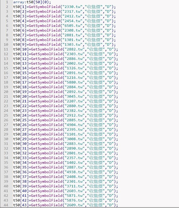是的,就小幫手所知目前是沒辦法做到在腳本中動態抓到前50大權值股票代號。