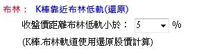 Input: Length(20, "期數"), LowerBand(2, "通道下緣"), N(5,"門檻(%)"); Ret = close < bollingerband(Close, Length, -1 * LowerBand) * ( 1 - N * 0.01);