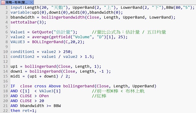 AND C[1] < VAlue3[1] //前一根K棒 < 布林上軌