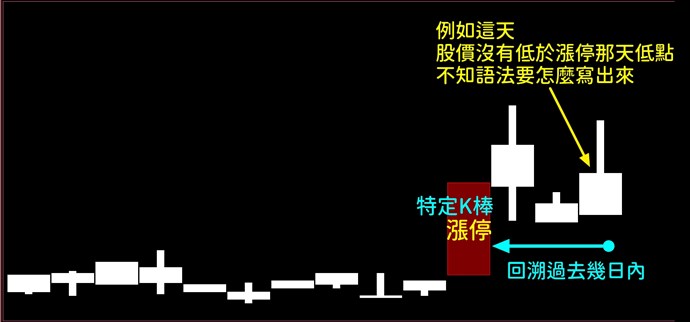 想寫出 股價 不低於 "過去設定天數內" "特定條件(例如漲停)" 的那根K棒低點 (如圖) 的選股語法