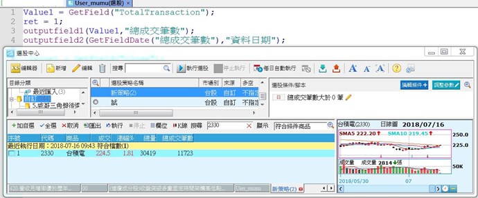 或者撰寫選股腳本程式碼 Value1 = GetField("TotalTransaction"); 取得總成交筆數數值,謝謝。