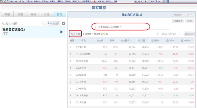 建議可以使用「策略/贏家選股」功能(需要有台股進階模組權限[每月300元]),例如“成交重心股”依下圖條件查詢後可以加入自選。