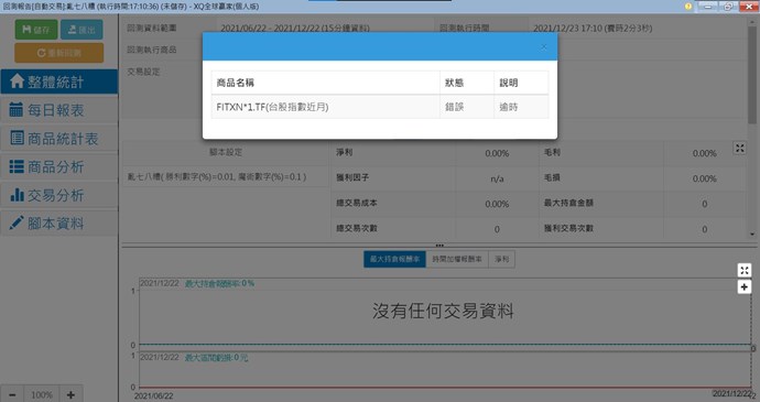 我已經兩天無法回測FITXN*1.TF(台股指數近月)請問為什麼