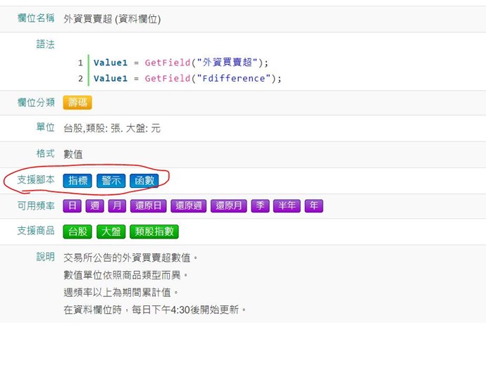 以外資買賣超為例,您可以在該項目看到他支援哪些腳本