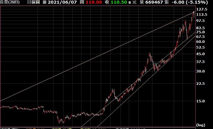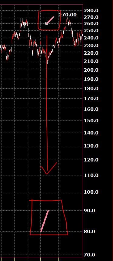 此問題會發生在對數座標軸,因目前畫圖是根據滑鼠點擊放開的兩個”價位”來畫線,而對數座標的格距並不是照座標的差距來畫的(80~90較260~270高),如圖所示,我們在250~260畫一條線段,複製到80~90,可以明顯看出為了保持價位差距10,斜率勢必會提升,所以當前的畫圖方法並沒有問題,如果要在對數座標畫出平行線,切換到其他座標軸會產生其他問題,(如:在對數座標複製斜率和滑鼠放開的點而讓線平行,在其他座標軸就不會跟對數座標在同個價位上,也不會是平行線)。所以目前在對數座標軸複製分析線的畫法會維持不變。