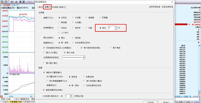您好,目前在商品盤勢按「右鍵/設定」的“繪圖”頁籤,可以選擇座標範圍,可以調整看看。