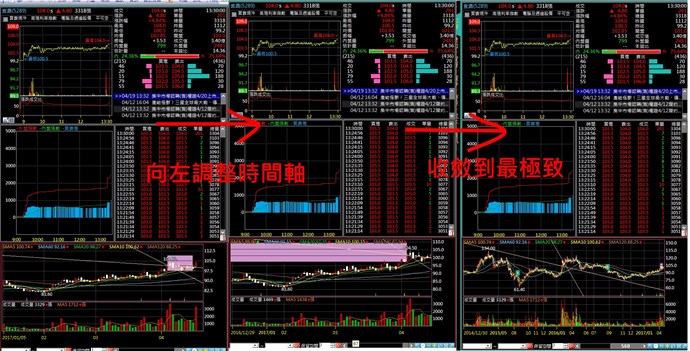 如附圖, 最左邊為原本的設置, 當向左移動時間軸會出現中間圖所示的狀況, 此外, 當按(-)收斂, 過程中會出現趨勢線不正確的繪製(最右邊的圖為收斂到極致的時候的狀況). 出現此狀況後, 通常我會先清除所有分析線, 再重繪, 會好一陣子(時間沒抓).
