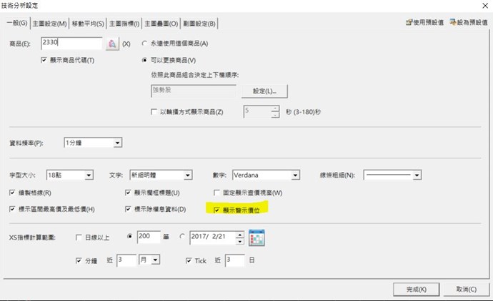 又若是兩個不同的系統頁面(例如綜合看盤左下方的技術分析,與從快捷頁點選進入技術分析頁面),也是2個不同頁面,“顯示警示價位”無法通用。