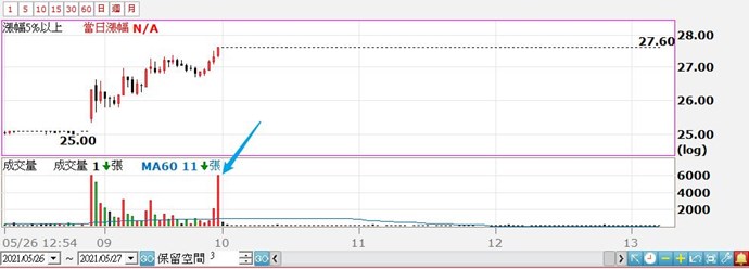 PS:下圖第二根箭頭我標錯標到9:20,我需要的是K棒完整後的成交量,而不是逐筆洗價瞬間大於第一跟成交量就警示.