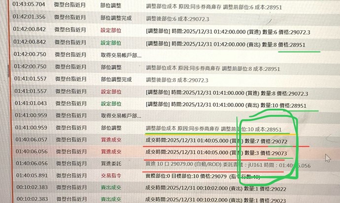 所以當天1/1-01:40的狀況是,進場的策略成本偵測錯誤(偵測到上一筆),所以導致連續觸發停利的設定進而連續賣出。(虧損