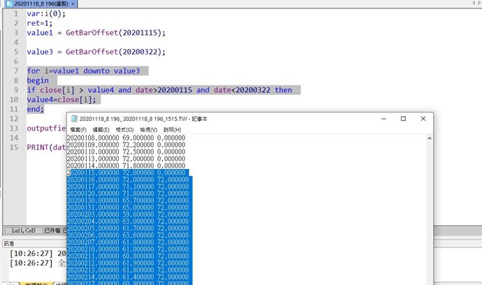for i=value1 downto value3 begin if close[i] > value4 and date>20200115 and date<20200322 then value4=close[i]; end;