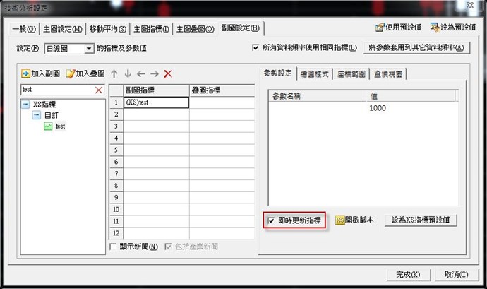關於 "指標每次跑過之後都不會自動更新" 這個問題,請您確認一下 "技術分析設定(Alt+Enter)" 是否有勾選即時更新指標?如下圖。