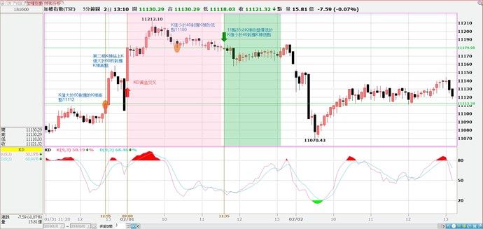 收盤價低於前面K值第一次小於40以下對應的K棒最低價之後,在收盤價沒有高於前面第一次K值大於60以上對應的K棒最低點為多頭趨勢