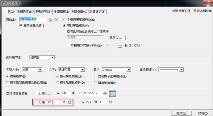 您好,請您在技術分系設定中,取消勾選「XS指標計算範圍:分鐘近 3 月」選項,再按下完成試試看,如圖,以上方向供參考,謝謝。