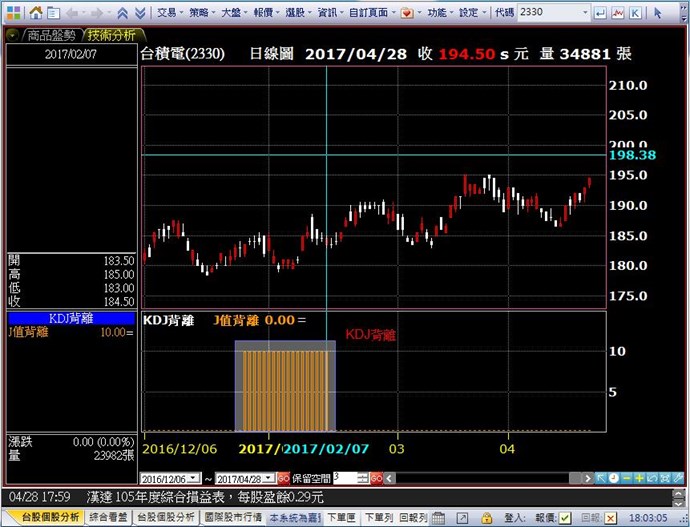 副圖的柱圖 = 10 則J值背離;否則無背離。