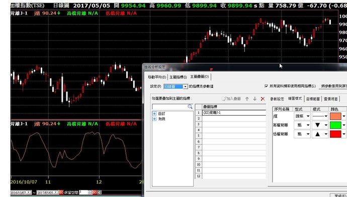2. 新增【指標】腳本,最後加入副圖指標,若副圖的柱圖 = 10 則J值背離;否則無背離。