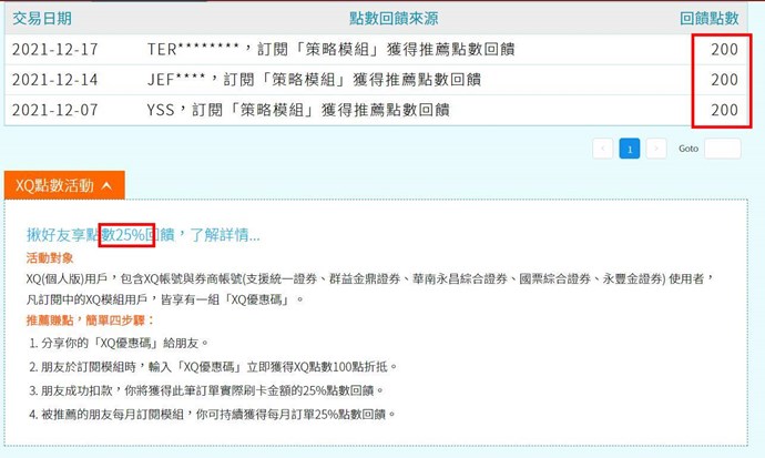 您好,於活動辦法有註明“您將獲得此筆訂單實際刷卡金額的25%點數回饋”,因使用您的推薦碼的3位用戶,都是抵掉200點,實際支付金額是800元(100點是之前活動的點數大放送[目前已無此活動],另100點是綁定您的優惠碼)