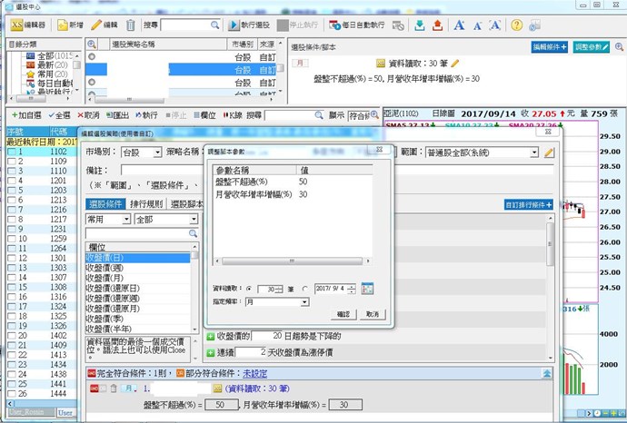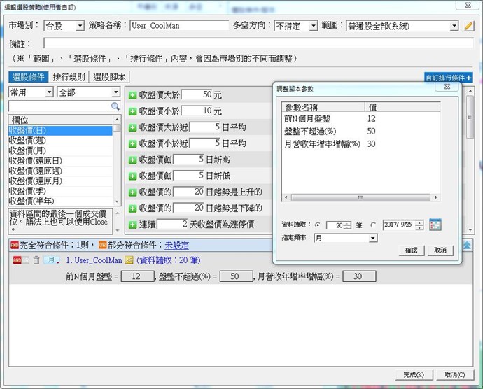 4. 使用 OutputField 函數,將相關數值列在選股中心列表中,以利檢驗數值正確(請參考 選股欄位放大鏡:談OutputField)