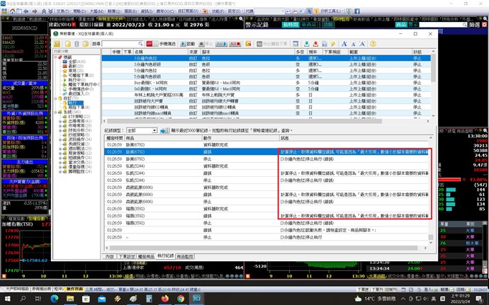 如果無法解決問題的話,需要麻煩您提供 策略雷達匯出檔勾選(包含)警示腳本 以及 XQ Log 來檢驗。