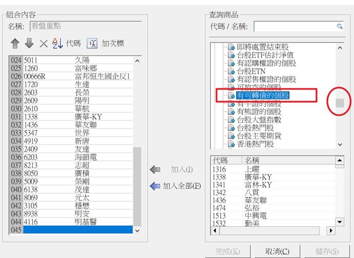 便可將「有可轉債的個股」一次全部加入商品組合中。