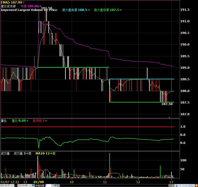 編譯了以下指標想隨著日內行情發展在主圖疊圖畫出最大量2分K的高低價. 只有最大量K棒的高低價才會顯示, 稍早的最高量高低價應該隨著新的最高量出現而消失.