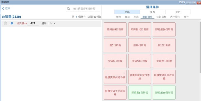 另外若雲端監控找不到您需要的條件,進階需求會需要XS策略雷達,策略雷達功能需購買「盤中量化交易模組」(每月1000元)。