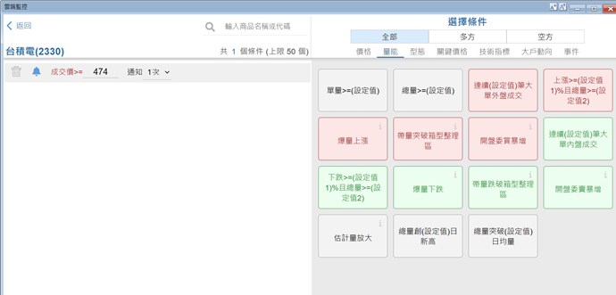 是否可以利用系統既有功能或是監控即時股價穿越均價線,以及監控成交量=499的警示?