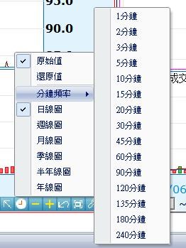 目前系統有提供的頻率類型如下,請利用技術分析圖下方工具列的時鐘樣式按鈕來切換,謝謝。
