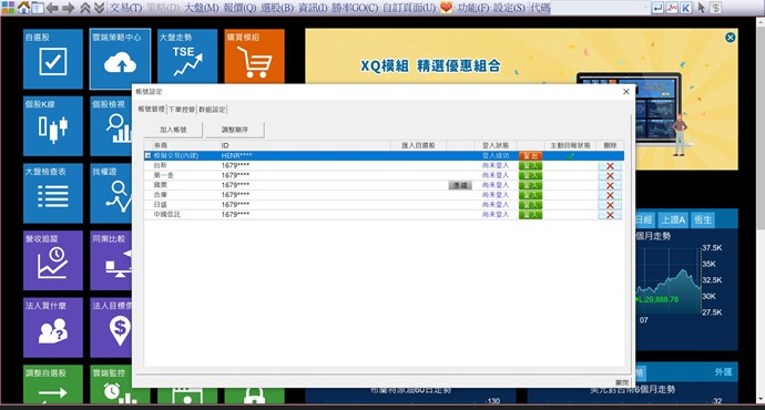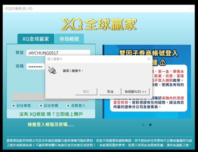 您好,煩請再協助提供您目前交易帳號的設定畫面【功能表的「交易→帳號設定」】,因只要有加入過,XQ就會啟動CA憑證元件。