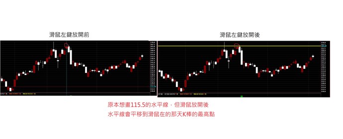 您好,目前在畫線以滑鼠拖曳的過程中,若有按鍵盤的PgUP(或Ctrl+Q)及PgDn(或Ctrl+A)可以準確定位該點的價位高低。