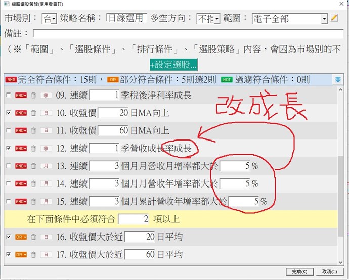這三個營收增率是否有腳本改寫為 "成長" 而不是%數,我在編輯選股條件>>設定選股>>選股條件>>1.2.3.,沒有 "成長" 條件 (重點是要月期不是季期的)