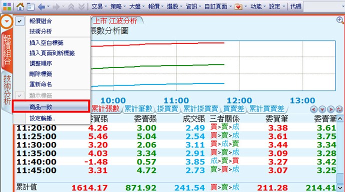 可以設定「商品一致」功能:在切換商品時,其他頁籤會跟著同步切換為相同商品。