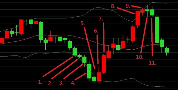 股價(high)碰到 布林通道up (位置8.) 保持到(位置11.) 賣出