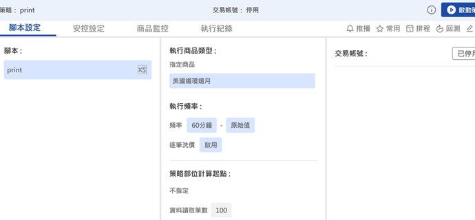 要檢驗您為什麼print不出來,需要麻煩您提供 回測腳本匯出檔 以及 回測的設定(截圖) 來檢驗。