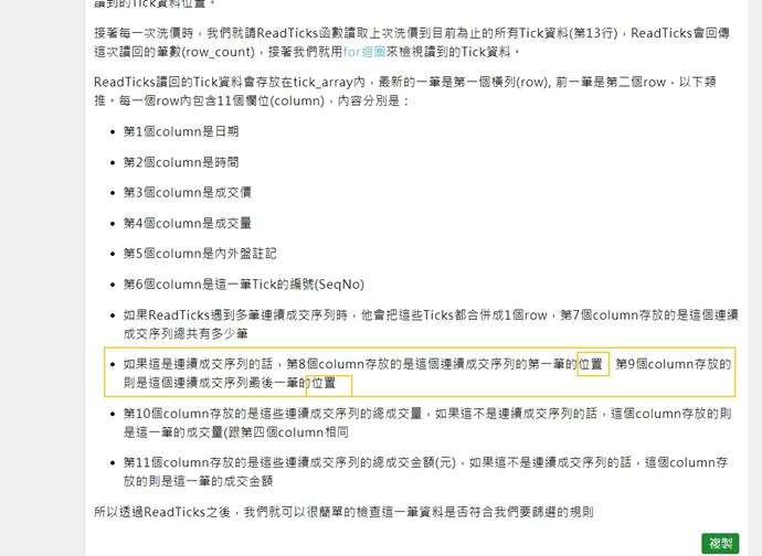 - 如果ReadTicks遇到多筆連續成交序列時,他會把這些Ticks都合併成1個row,第7個column存放的是這個連續成交序列總共有多少筆