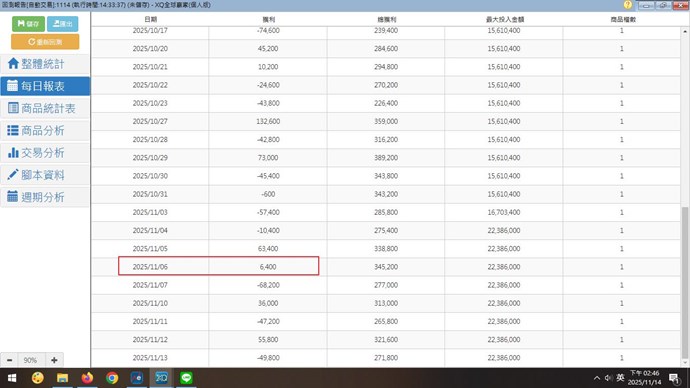 每日報表的計算是以11/6的收盤價當作損益(+6400)