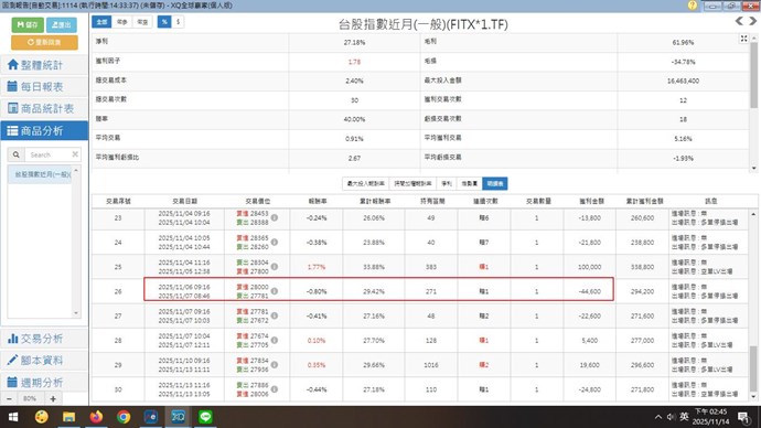 真實的績效應該是11/6進場 11/7出場(-44600)